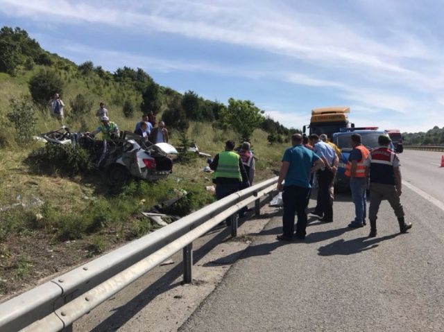 Düzce TEM otoyolunda park halindeki tıra arkadan çarparak parçalanan otomobildeki 4 kişi hayatını kaybetti.