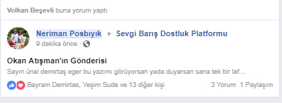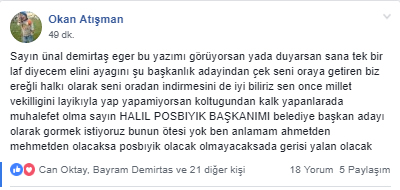 Sosyal medya üzerinden atışma şeklide geçen tartışmalarda iş farklı boyuta taşındı.. Okan Atışman adlı vatandaşın CHP Zonguldak Milletvekili Ünal Demirtaş'a hitaben sarfettiği 'şu başkanlık adayindan çek seni oraya getiren biz ereğli halkı olarak seni oradan indirmesini de iyi biliriz' sözlerini Kdz.Ereğli Belediye Başkan aday adayı Halil Posbıyık'ın eşi Neriman Posbıyık'ın paylaşması dikkatlerden kaçmadı!..