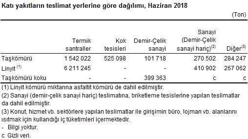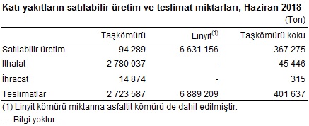 Katı yakıtların 2018 yılı Haziran ayı toplam satılabilir üretim miktarlarına bakıldığında; taşkömürünün 94 bin 289 ton, linyitin(1) 6 milyon 631 bin 156 ton ve taşkömürü kokunun 367 bin 275 ton, teslimat(2)miktarlarına bakıldığında ise; taşkömürünün 2 milyon 723 bin 587 ton, linyitin 6 milyon 889 bin 209 ton ve taşkömürü kokunun 401 bin 637 ton olarak gerçekleştiği görüldü.
