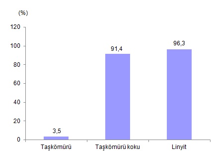 Üretilen katı yakıtların teslimatları karşılama oranı(3) %3,5 ile en düşük taşkömüründe gerçekleşti. Bu oran taşkömürü kokunda %91,4 iken linyitte %96,3 olarak hesaplandı.
