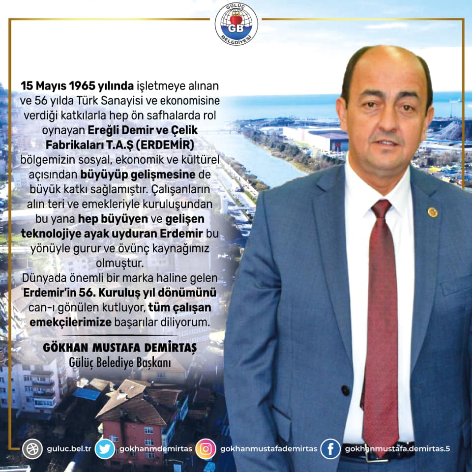 Erdemir'in 56. yılı nedeniyle Kdz.Ereğli Belediye Başklanı Halil Posbıyık ve Gülüç Belediye Başkanı Gökhan Demirtaş, birer kutlama mesajı yayınladı..