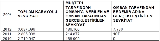 Son üç yılda karayolu ile nakledilen ürün tonajları toplamı, toplam sevkiyat içerisinde OMSAN Lojistik A.Ş.’nin payı ve OMSAN Lojistik A.Ş. tarafından taşınan ürünlerden ne kadarının nakliyesi ERDEMİR’e ait olan taşıma olduğu bilgileri aşağıda verilmektedir.