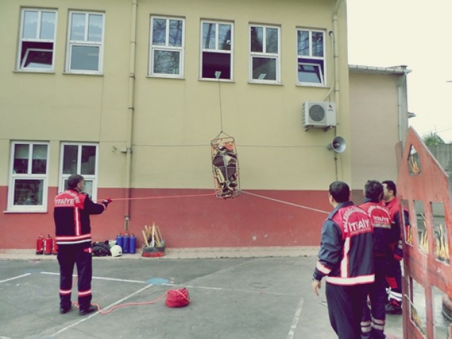 Okul bahçesinde yakılan ateş öğrenciler tarafından söndürüldü. Bu sırada öğrencilere yangına müdahale ve yangın söndürme cihazları hakkında bilgiler verildi. Ayrıca yangında kalan bir insanın sedye ile kurtarma çalışması yapıldı Tatbikat öğrenciler tarafından ilgi ve heyecanla karşılandı.