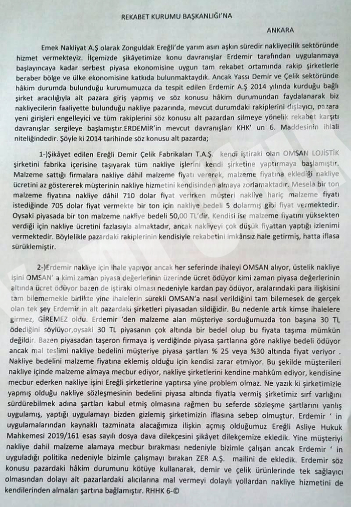 Öz Emek Anonim Şirketi Yetkili temsilcisi M. Batu Müftüoğlu, OYAK iştiraki Erdemir'i, nakliye, acenta ve liman işletmesi konularında Rekabet Kuruluna şikayet etti..