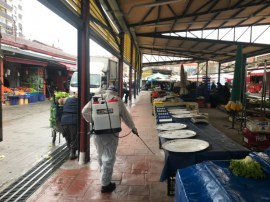 Halkın yoğun bulunduğu ortak kullanım alanlarını sürekli olarak dezenfekte eden Veteriner İşleri Müdürlüğü Vektör İlaçlama ve Kontrol Merkezi ekipleri, bugün sabah erken saatlerde merkez pazar yerini dezenfekte etti. Çalışmalar Tuhafiyeciler Çarşısı’nda devam etti.