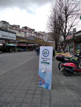 Zabıta Müdürlüğü ekipleri de pazar yeri girişine dezenfekte standı koydu. Maske denetimleri devam ediyor.