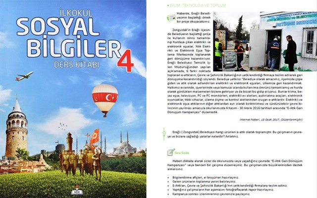 Sosyal Bilgiler 4. Sınıf kitabında, fotoğraflı bir şekilde yer alan ‘Ereğli Belediyesi’nin örnek projesi haberi sonrası öğrencilere, ‘Ereğli(Zonguldak)Belediyesi hangi ürünleri e-atık olarak toplamıştır. Bu çalışmanın çevreye ve bizlere sağladığı yararlar nelerdir? Anlatınız’ sorusu soruluyor.