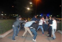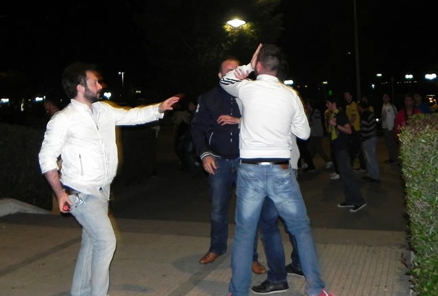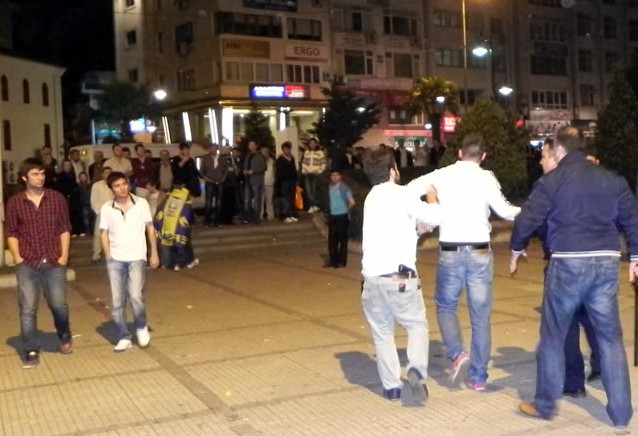 Bir süre sonra aynı yerde Galatasaraylı taraftarların da toplanmaya başlamaları üzerine polis iki takım taraftarlarını karşı karşıya getirmemek için yoğun çaba gösterdi. Fenerbahçe taraftarları Atatürk Anıtı önüne alındı. Yaklaşık yarım saat içerisinde iki takımın taraftarlarının sayısının bir anda artması üzerine polis Devrim Bulvarı caddesini çift yönlü olarak trafiğe kapattı. İki takım taraftarları birbirlerine konfetiler attı. Polis taşkınlık yapan taraftarları sakinleştirmeye çalışırken bir polis memuru alkollü Fenerbahçe taraftarlarının arasında kaldı. Polis memuru, elbisesinden tutmaya çalışan taraftarları dağıtmak için biber gazı kullandı. Fenerbahçe taraftarları polisin biber gazı kullanmasına sinirlenerek bazı polislerin üzerine yürümeye kalkınca alanda bulunan diğer polisler tekrar biber gazı ve cop kullanarak taraftarları kısa sürede dağıttı. Polisten kaçan çok sayıda taraftar ara sokaklara dağıldı. 2 kişinin gözaltına alındığı öğrenildi.