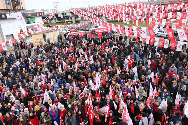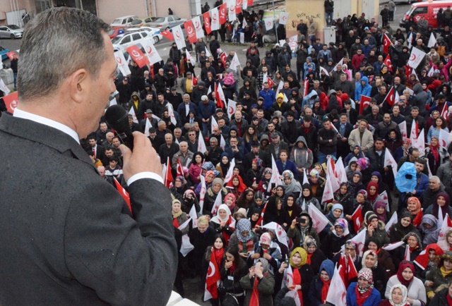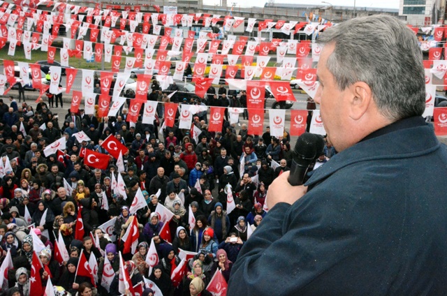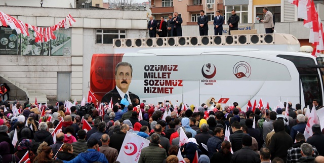 Kdz. Ereğli Plajlar bölgesinde çiçeklerle karşılanan ve Başkan Uysal ile birlikte seçim otobüsüyle ilçeyi gezerek halkı selamlayan Genel Başkan Destici, BBP Seçim Koordinasyon Merkezi yanındaki otopark alanında halka hitap etti.