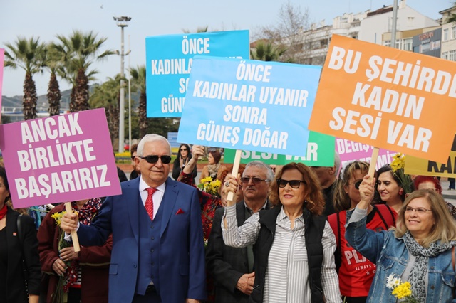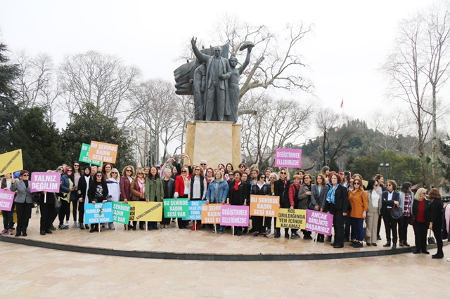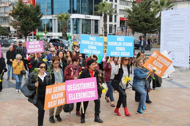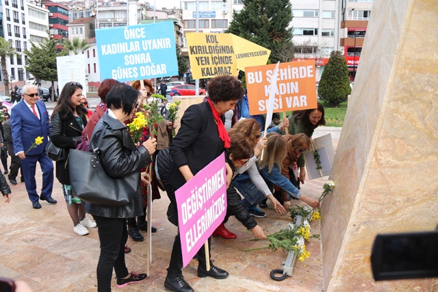Kdz. Ereğli'de kadınlar ellerinde dövizlerle 8 Mart için Atatürk Anıtı önünde buluştular. Kadın kuruluşları, kadın grupları, pek çok partinin kadın kolları temsilcileri, sanatçılar, edebiyatçılar, üreten kadınlar, kamu kuruluşlarından kadın temsilciler Kent Konseyi Kadın Meclisi'nin çağrısıyla bir araya geldi. Kadınlar mesajlarını, Atatürk'e yazdıkları mektupla dile getirdiler. Karadeniz Ereğli Belediye Başkanı Halil Posbıyık, Atatürk Anıtı önündeki buluşmaya eşi Neriman Posbıyık'la beraber katıldı ve "Ancak beraber çözebiliriz" mesajı verdi.