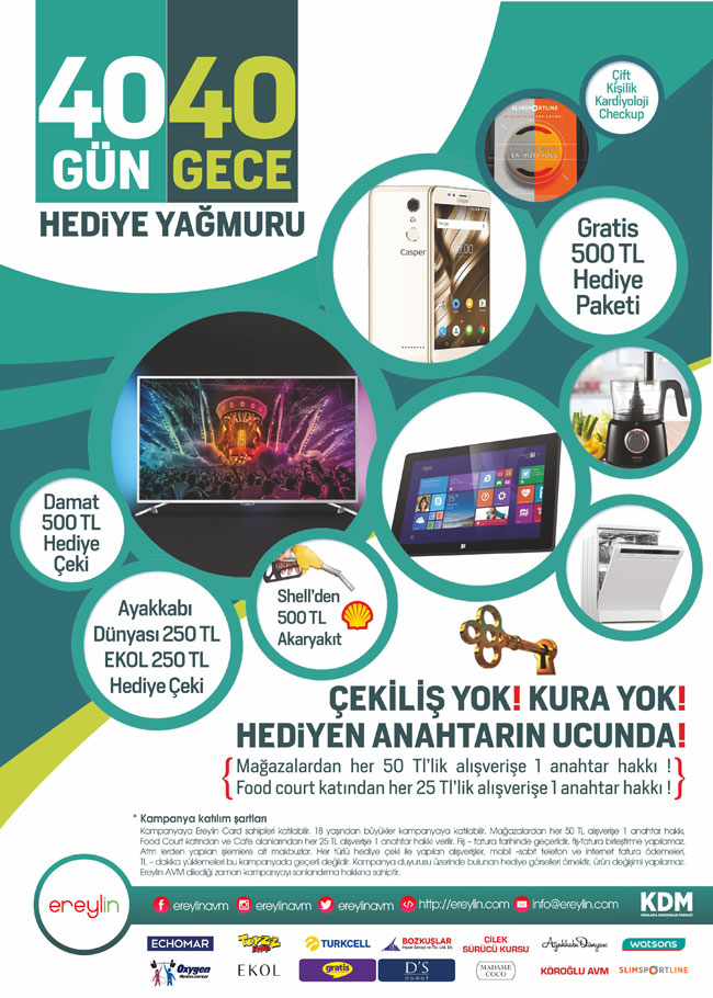 "10 Kasım Cumartesi günü (yarın) başlayacak olan ve 40 Gün 40 Gece sürecek olan kampanyada, Mağazalardan 50 TL alışveriş yapan, Food Court katından 25 TL alışveriş yapan ziyaretçilerimize 1 anahtar hakkı veriliyor doğru anahtarı bulana; Cep Telefonundan, Buzdolabına, Televizyondan, Çamaşır Makinesine, Bulaşık Makinesinden, Akaryakıta bir çok sürpriz hediye sizleri bekliyor."