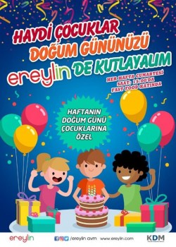 "Ereylin alışveriş merkezinin düzenlemiş olduğu doğum günü etkinliği 22 eylül cumartesi günü (bugün) başlamış olup , her cumartesi 15:00 – 17:00 saatleri arasında food court katında devam edecektir. Tüm çocuklarımızı her hafta yapılacak olan eğlencemize bekleriz .