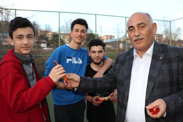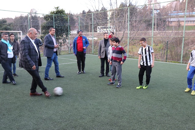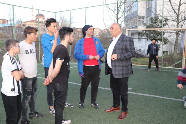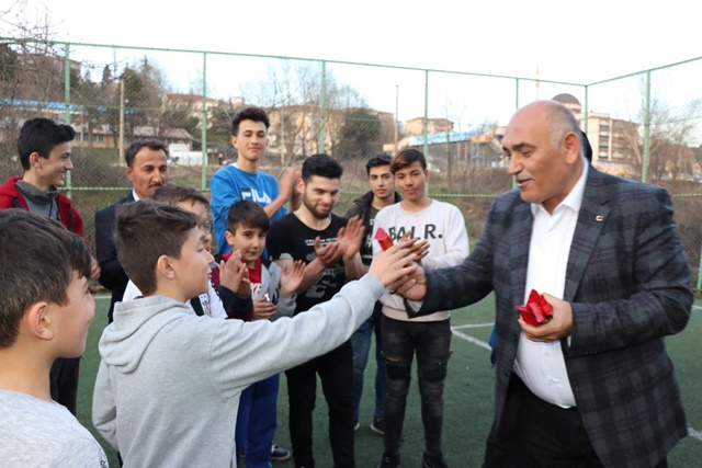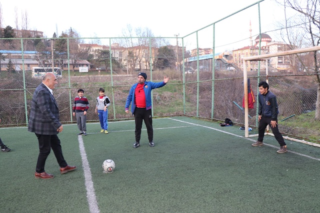 Şahin Mahallede bulunan halı sahada gençlerle top oynadı ve penaltı atışı yaptı.