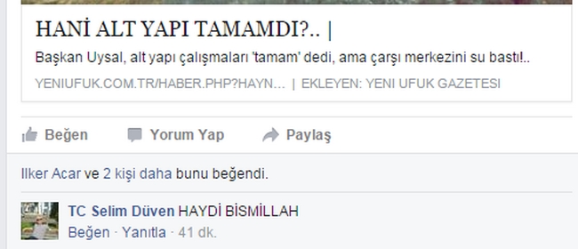 Özbek: "Yaşı yetenler bilir. Sahilimize kanalizasyon akardı. Sahil yolundan hastaneye yarim saatte gidilirdi. Yollar çukurdan geçilmezdi. CÖBEKOĞLU alt yapıya buyuk önem verdi. B.... kurtulduk. SIDAL Askeri yönetiminde sahili asfaltla kapladı. Sonra gelen malum şahıs sahil bandını muhteşem yaptı. AVRUPA KENTi olduk. Uysal başkanın geldiğinden beri hiç birşey yapmamasını da onunda kendinin AVRUPA KENTi aldığını sanıyor. Herhalde Başkanım avrupa kenti falan değiliz. Alt yapı diye bir şey yok. Her yeri sel aldı. Bu size bir ders olsun. Gerçek belediyeci olun artık. Çiçekle böcekle olmuyor bu isler. Giyin çizmelerinizi, vurun kazmayı. KREDiNiZ TÜKENMEK ÜZERE", şeklinde konuştu...
