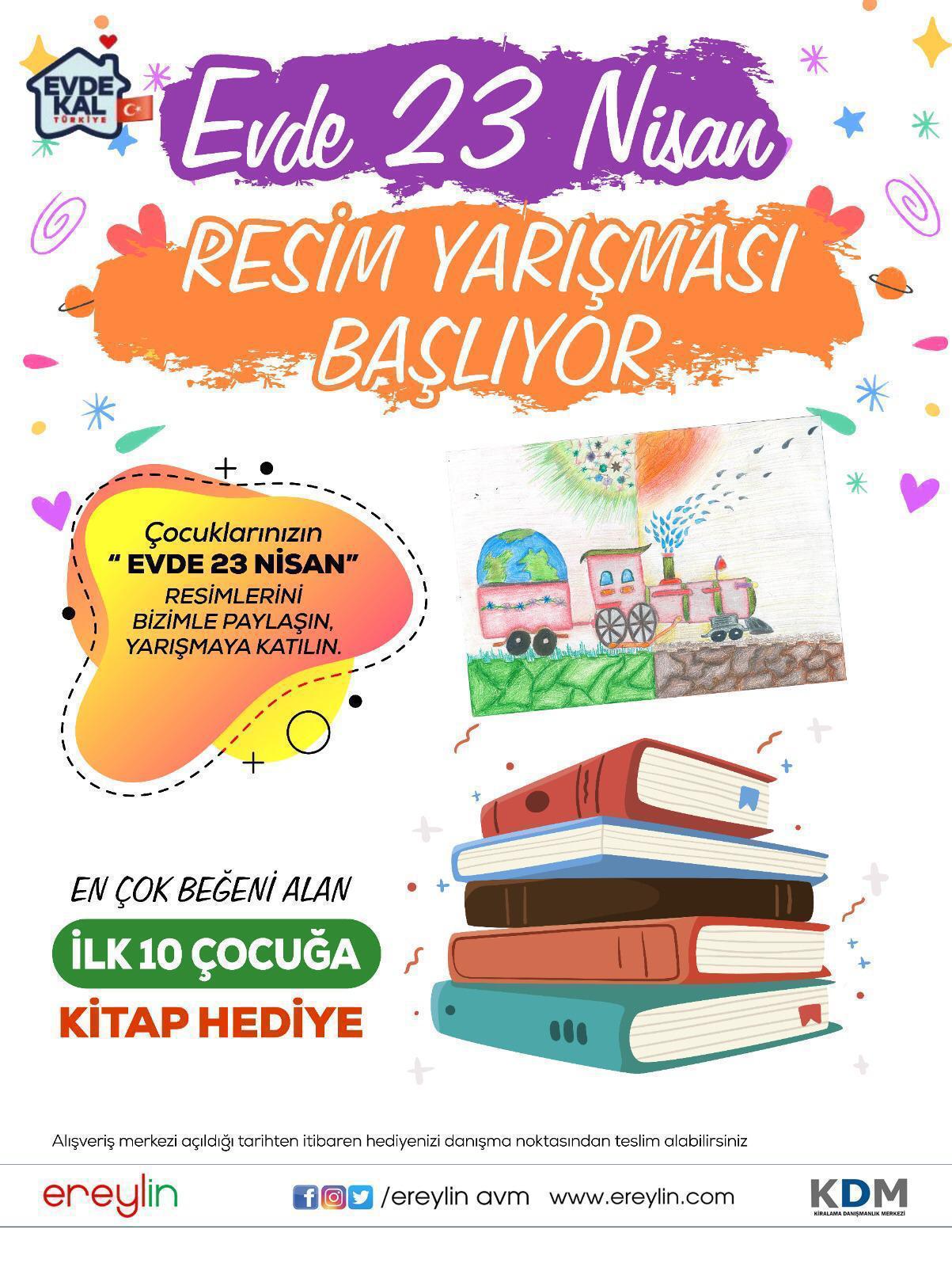 "Ereylin avm ınstagram hesabımızda düzenlediğimiz “Evde 23 Nisan “ temalı resimlerini 23 Nisan Perşembe gününe kadar bizimle “DM yolu” ile göndererek storylerde oylamaya sunulacaktır. En çok beğeni alan ilk 10 çocuğa kitap hediye edilecektir.Tüm çocuklarımıza iyi şanslar dileriz. 23 Nisan Uludal Egemenlik ve Çocuk Bayramımız Kutlu Olsun"