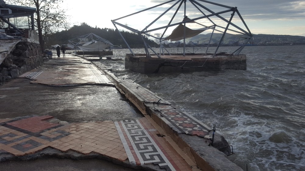 Boyu zaman zaman 9 metreyi aşan şiddetli fırtına nedeniyle bir kuru yük gemisini Amfi Tiyatro yanında ikiye bölünerek karaya oturdu, askeri mendireğe çarpan bir geminin battığı içindeki 13 mürettebattan 1’nin cansız bedenine ulaşıldığı yetkililerce açıklandı.