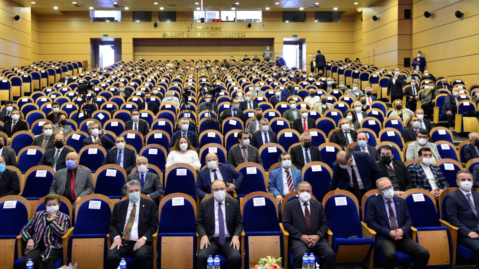 Konuşmalarına üniversitenin akademik ve bilimsel alanda elde edilen projeleri hakkında bilgi vererek başlayan Rektörümüz Prof. Dr. Mustafa Çufalı, Zonguldak Bülent Ecevit Üniversitesinin pandemi sonrasında yüz yüze eğitim faaliyetlerine, akademik ve bilimsel projelerine kaldığı yerden devem ettiğini, bu bağlamda küresel değişime ayak uydurarak hedeflerine odaklandığını, büyümeye ve ilerlemeye devam edeceğini söyledi. Özellikle Grizu-263 Uzay takımının dünya çapındaki başarıları, B-Dispate takımının 2021 Teknofest Model uydu Türkiye birinciliği olmak üzere bir çok başarılı proje ile şehrin ve bölgenin tanıtımında önemli rol oynadığını belirtti, sağlık kampüsünün ülke çapında imza attığı başarılar hizmete giren çok katlı yeni kütüphane binası ve ilahiyat fakültesi binası, 15 Temmuz Şehitler Kampüsü, yeni inşa edilecek poliklinik binası, projesi devam eden merkezi derslik ve spor kompleksi hakkında da bilgilendirmede bulundu.