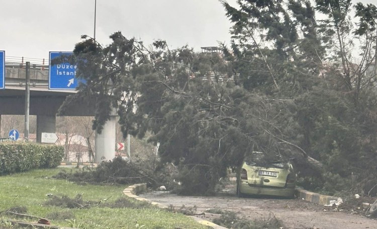 Fırtına’da devrilen ağaç aracın üstüne düştü