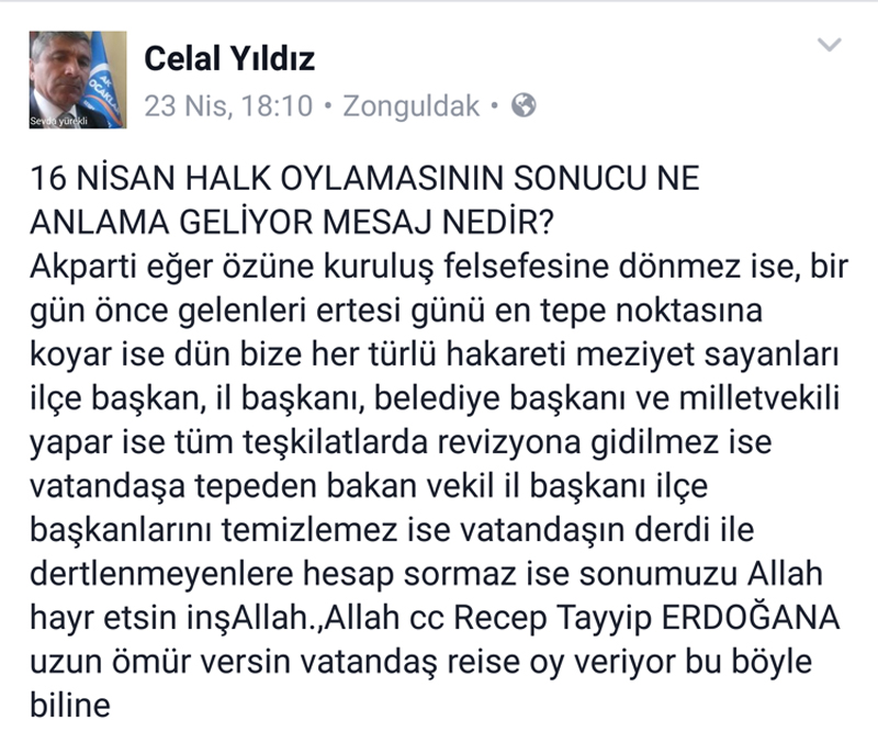 16 Nisan referandumunda Kdz.Ereğli AK Parti İlçe Teşkilatı tarafından Seçim ve Koordinasyon Merkezi Başkanı olarak belirlenen Celal Yıldız, sosyal medya hesabından AK Parti teşkilatlarına ve milletvekillerine ateş püskürdü..