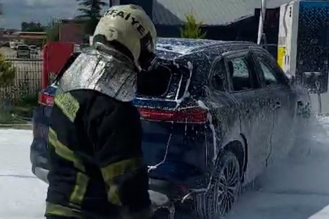 7 Mayıs'ta meydana gelen araç yangınında 40 ton su ve daha önceden elektrikli araç yangınlarına müdahale için numune olarak alınmış olan özel köpükten 15 litre kullanılarak müdahale edildi. Alevli yanma bitirildikten sonra, lityum bataryalar aracın altında gömülü olduğu için araç teleskopik forklift ile kaldırılarak müdahaleye devam edildi. Bir saatlik müdahale sonrasında ekipler soğutma çalışmasına geçti.