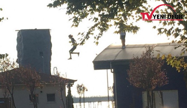 Görüntülerde 3 gencin paten pisti'nin bulunduğu yaklaşık 10 metre yükseklikteki çatıda, tuvaletlerin bulunduğu binanın çatısına atladığı, sona kalan gencin ise tereddütü dikkatlerden kaçmıyor..