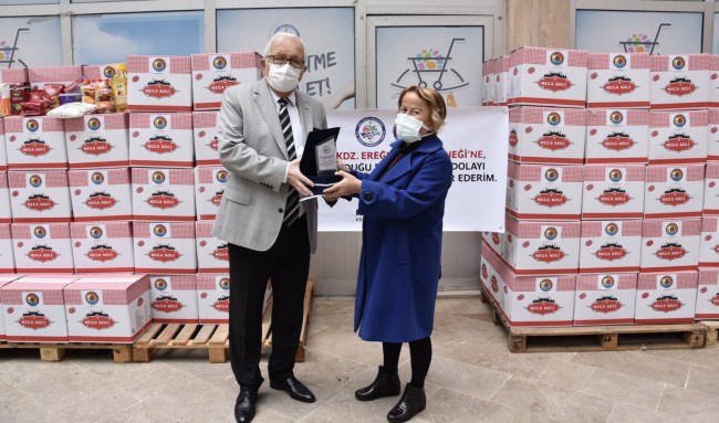 “Hayırsever vatandaşlara, Ereğli’yi seven arkadaşlara mübarek ramazan ayında, pandeminin ortaya getirdiği sıkıntılı bir ortam nedeniyle dayanışma çağrısında bulunduk. Sağ olsunlar yardımlara çağrılar yerini buluyor. Ben özellikle, Ereğli halkı adına şükranlarımı sunuyorum. Çok zor bir süreçten geçiyoruz. Hem muhtaç insanlarasıcak yemek gönderiyoruz hem de genç yaşta komilik yapan, şoförlük yapan, odacılık yapan boşta kalan insanlara sıcak yemek gönderiyoruz ve koli yardımı yapıyoruz.Çağrımıza her taraftan talepler geliyor, yardımlar geliyor. Bazı isimleri açıklamıyoruz, kendileri rica ettikleri için. Bizi mutlu edenlerden biri sesimiz Almanya’ya kadar gitmiş ve Avrupa Karadeniz Ereğlililer Derneği bütün arkadaşları ile birlikte toplanmışlar ve 220 koli bize kumanya göndermişler. Yaklaşık 36 bin 500 TL değerinde. Buradan Avrupa Karadeniz Ereğlililer Derneği üyelerine,değerli hemşerilerime bu yardımı yapan bütün insanlarımıza Ereğli halkı adına şükranlarımı sunuyorum. Bugünün anısına onlara plaket sunmak istiyorum. Avrupalılar Karadeniz Ereğlililer Derneği Başkanı ve Yönetim Kurulu üyelerine ve bütün üyelereteşekkür ediyorum.