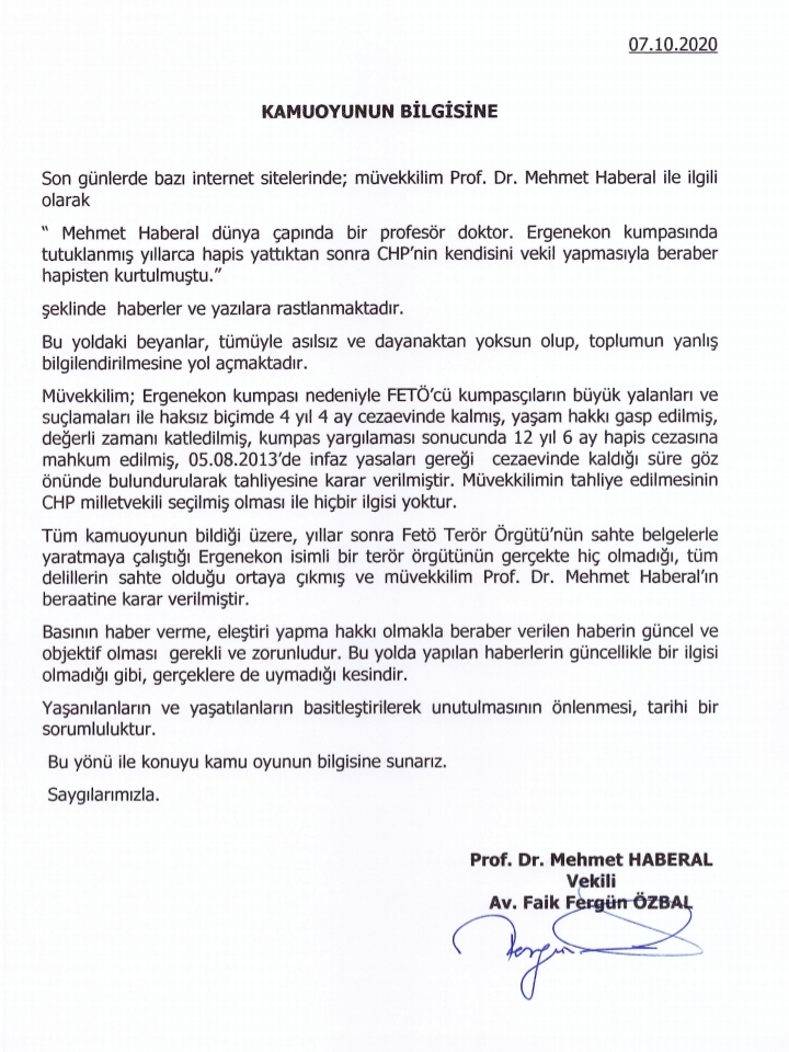 Prof. Dr.Mehmet Haberal'ın vekili Av. Faik Fergün Özbal, son günlerde bazı internet sitelerinde Haberal'ın 'Ergenekon kumpasından yıllarca hapis yattıktan sonra CHP'nin kendisini vekil yapmasıyla beraber hapisten kurtulduğu' yönünde yer alan haberleri yalanladı. Özbal, beyanların toplumun yanlış bilgilendirilmesine yol açtığını vurgulayarak şunları söyledi: "Son günlerde bazı internet sitelerinde millet müvekkilim prof Dr Mehmet Haberal ile ilgili olarak “Mehmet Haberal dünya çapında bir profesor doktor. Ergenekon kumpası nda tutuklanmış yıllarca hapis yattıktan sonra CHP’nin kendisini vekil yapmasıyla beraber hapisten kurtulmuştu.”