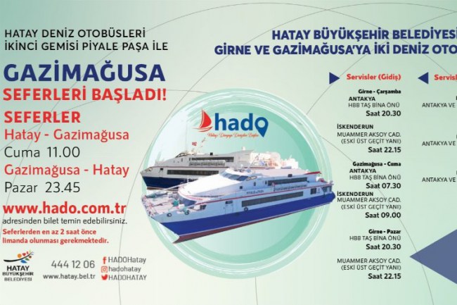 Hatay Deniz Otobüsü'nün Gazimağusa seferleri 5 Ağustos'ta başlıyor.HATAY (İGFA) - 19 Mayıs'ta ilk seferini Kuzey Kıbrıs Türk Cumhuriyeti'nin Girne kentine yapan HADO'nun ikinci durağı Gazimağusa oldu.