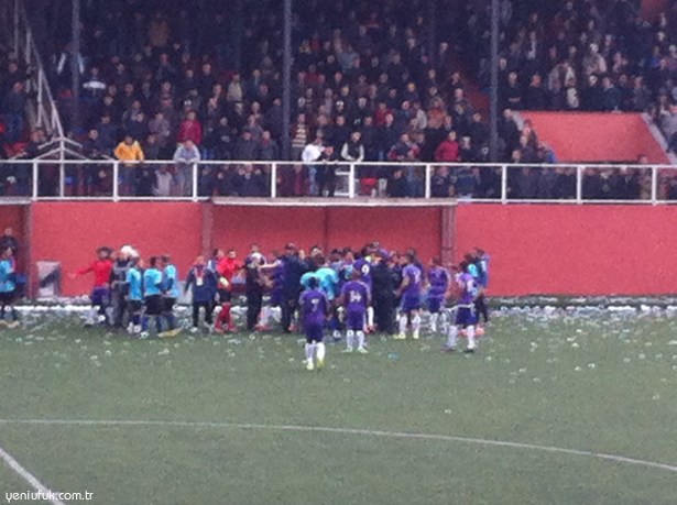 Maçın 72. Dakikasında saha içerisinde başlayan olayların akabinde hakemin kararına kızan bir grup taraftar saha içerisine yabancı cisimler yağdırdı.