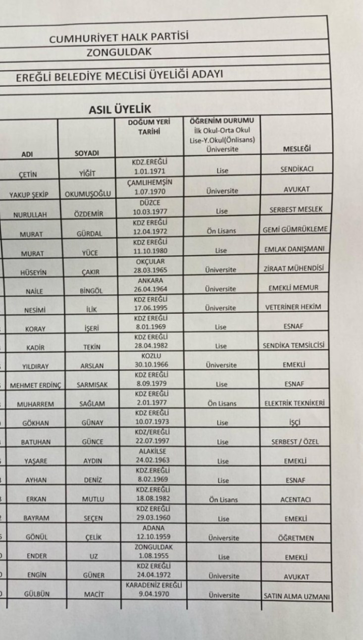 CHP Kdz.Ereğli Belediye Meclis Üyesi listesi belli oldu.