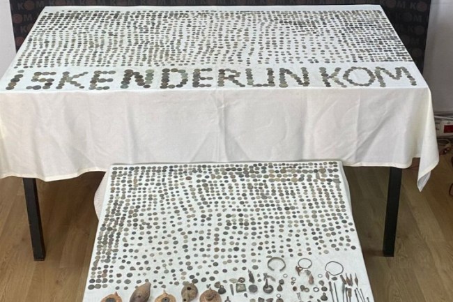 Hatay'da İskenderun İlçe Emniyet Müdürlüğü KOM Grup Amirliği'nce gerçekleşen tarihi eser operasyonunda yüzlerce sikke ve objeler ele geçirildi.