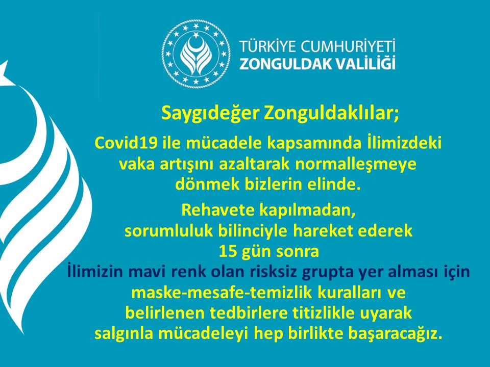 Covid 19 ile mücadele kapsamında İlimizdeki vaka artışını azaltarak normalleşmeye dönmek bizlerin elinde. Rehavete kapılmadan, sorumluluk bilinciyle hareket ederek 15 gün sonra ilimizin mavi renk olan risksiz grupta yer alması için maske-mesafe-temizlik kuralları ve belirlenen tedbirlere titizlikle uyarak salgınla mücadeleyi hep birlikte başaracağız." ifadelerine yer verildi.