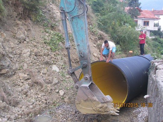 1- Çomaklar deresinde heyelan kütlesinin riske ettiği yerleşim bölgesinde dere yatağı kontrollü olarak açılmış, bu kısımda kuruda çalışma yapılabilmesi için membadan (yukarıdan) su motopomlarla birlikte dere dışına derive edilmiştir. Getirilen tuvenan (dolgu) malzemesi tabana serilmiş, AFAD Müdürlüğü tarafından temin edilen 2.000 mm çapında korge borular 31.07.2015 tarihinden itibaren dere yatağına serilen dolgu malzemesi üzerine montajına başlanmıştır. Korge borular özel üretim olduklarından günde 2 adet üretim yapılarak çalışma sahasına nakledilmektedir.