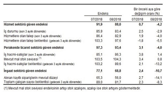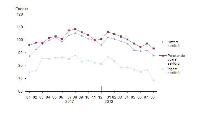 Mevsim etkilerinden arındırılmış sektörel güven endeksleri, Ağustos 2018