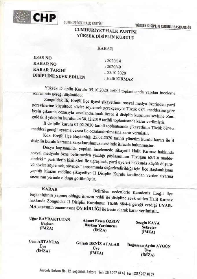 Kişisel sosyal medya hesabından parti yöneticilerini ağır bir dille eleştirdiği gerekçesiyle CHP Kdz.Ereğli İlçe Örgütü tarafından ihraç istemiyle disipline sevk edilen Ormanlı beldesi sakini CHP'li Halit Kırmaz'a CHP İl Disiplin Kurulu 'uyarı' cezası verdi.