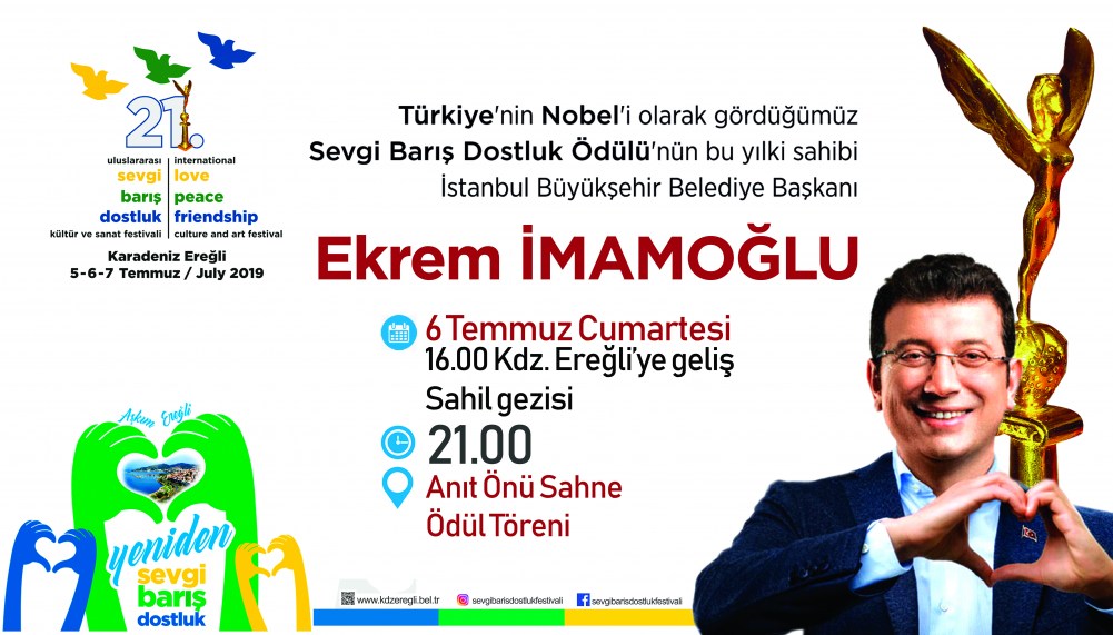 Barış, dostluk ödülünün bu yılki sahibi İBB Başkanı Ekrem İmamoğlu’nun Ereğli