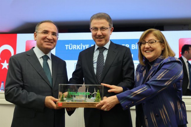 Başkan Deniz Köken ödülünü, Adalet Bakanı Bekir Bozdağ ile Gaziantep Büyükşehir Belediye Başkanı Fatma Şahin'in elinden aldı.