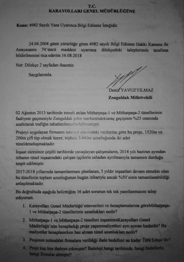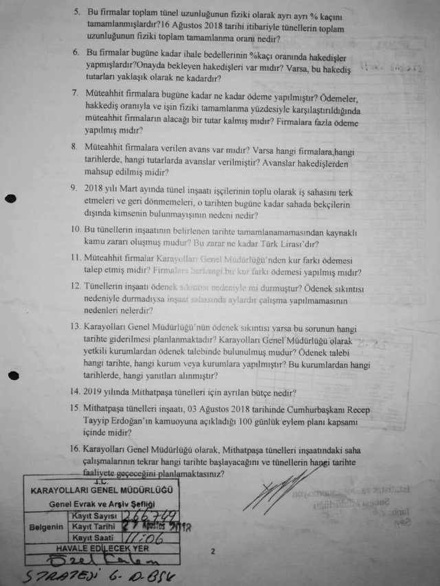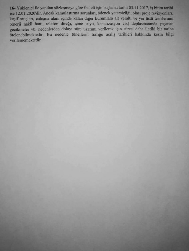 Milletvekili, 16 Ağustos tarihinde Mithatpaşa Tünellerinin akıbetiyle ilgili olarak sunduğu 16 sorudan oluşan Bilgi Edinim dilekçesine 11 Eylül tarihi itibariyle bölge müdürlüğünce verilen yanıtları da dün sosyal medya hesaplarından yayınlayarak kamuoyuyla paylaştı. Yavuzyılmaz, paylaşımında özellikle 15. sorunun yanıtına dikkat çekti. KGM bu soruya verdiği yanıtla, 6 aydır çalışmaların durduğu Mithatpaşa Tünelleri inşaatının, 100 günlük eylem planı içinde yer almadığı belirtti.