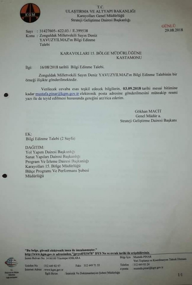 Cumhuriyet Halk Partisi Zonguldak Milletvekili ve TBMM Kit komisyonu üyesi Deniz Yavuzyılmaz, geçtiğimiz günlerde Kastamonu'ya giderek Zonguldak’ın bağlı olduğu Karayolları 15. Bölge Müdürlüğü’nü ziyaret etmiş ve Bölge Müdürü Hüsamettin Özendi ile görüşerek Zonguldak'ta yapımı sürdürülen karayolları ve yollardaki güvenlik tedbiri eksiklikleri hakkında görüşmelerde bulunmuştu.
