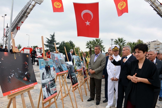 Protokol üyeleri, itfaiye ekipmanları ve kullanılışları konusunda itfaiye personelinden bilgi aldı. İtfaiye ekipmanlarının tanıtıldığı sergi, gün boyunca halkın ziyaretine açık kalacak.