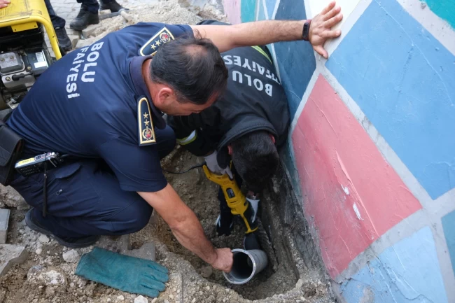BOLU (İGFA) - Bolu iline bağlı Borazanlar Mahallesi'nde bulunan bir özel okulun önündeki borudan içeri düşen yavru kedi, civarda bulunan duyarlı bir vatandaşın belediyeye haber vermesi üzerine kurtarıldı. 1 buçuk metrelik derinlikte sıkışıp kalan yavru kediyi kurtarmak için seferber olan ekipler, öncelikle borunun üzerindeki betonu kırdı. Ardından itfaiye aracında hazır bulunan elektrikli kesim motoruyla boru kesildi ve yavru kedi sağ salim çıkartıldı.