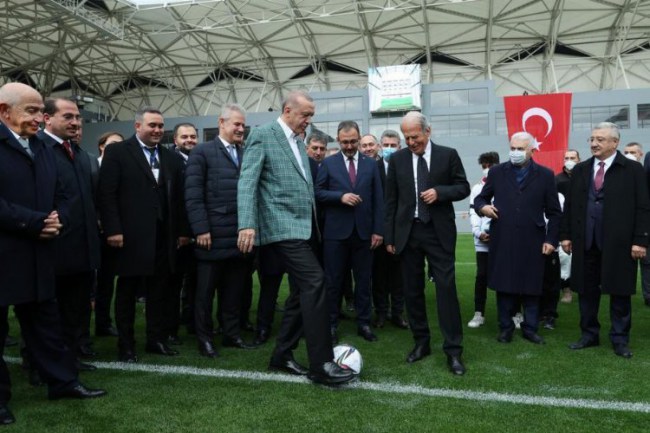 İzmir programı kapsamında Deprem Konutları Teslim Töreni`nin ardından Cumhurbaşkanlığı otobüsüyle halkı selamlayarak Alsancak semtine geçen Cumhurbaşkanı Erdoğan, yapımı tamamlanan Alsancak Mustafa Denizli Stadı`nın açılış törenine katıldı.