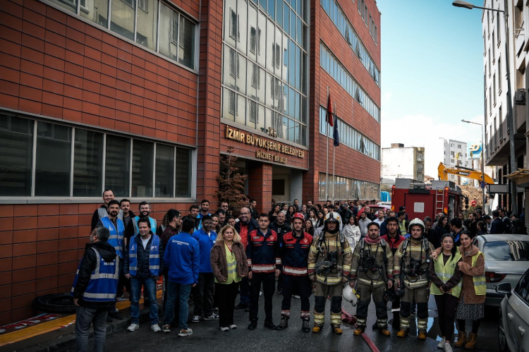 İzmir Büyükşehir Belediyesi, Oğuzlar Ek Hizmet Binası'nda düzenlediği deprem ve yangın tatbikatıyla personelin kriz anlarında doğru, hızlı ve koordineli hareket etme becerisini güçlendirdi; gerçeğini aratmayan senaryoyla afetlere hazırlık bir kez daha test edildi.