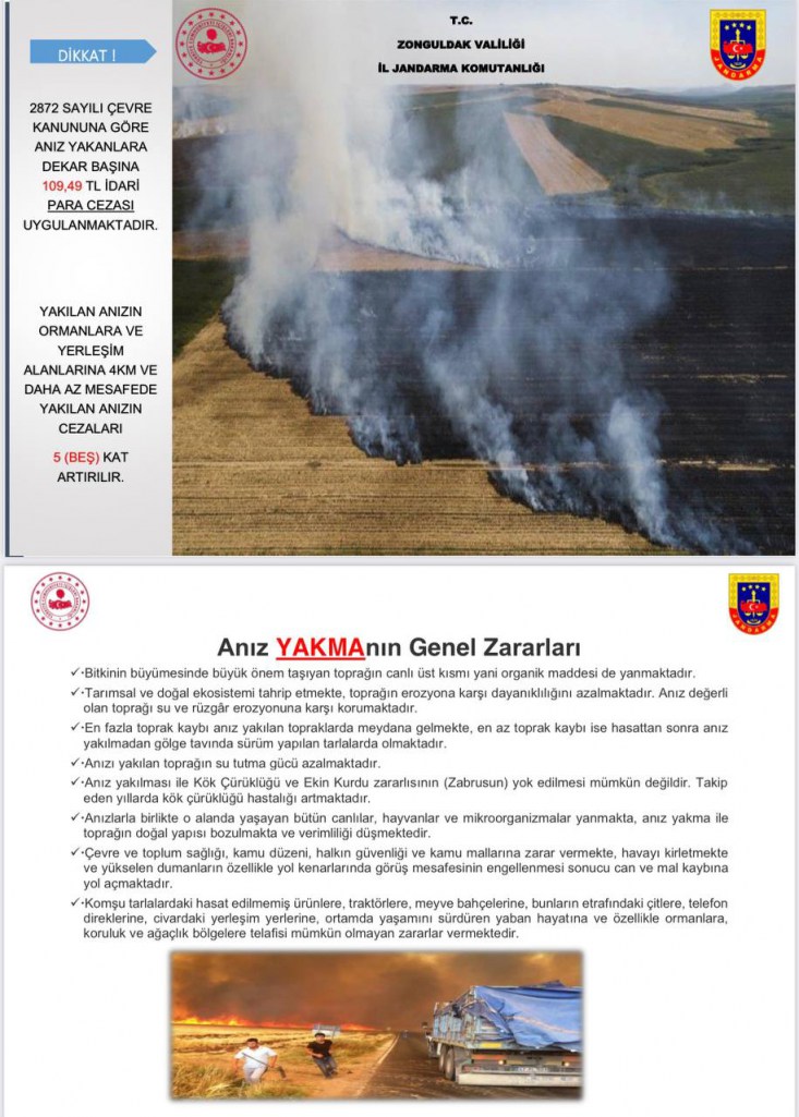 Zonguldak İl Jandarma Komutanlığına bağlı Çevre, Doğa ve Hayvanları Koruma Timince, Merkez İlçe Jandarma Komutanlığı sorumluluk alanında bulunan tarımla uğraşan çiftçilere “Anız Yakmanın Zararları” konusunda bilgilendirme yapılmıştır. Ayrıca, vatandaşların görebileceği yerlere afişler asılmış ve broşür dağıtılmıştır.