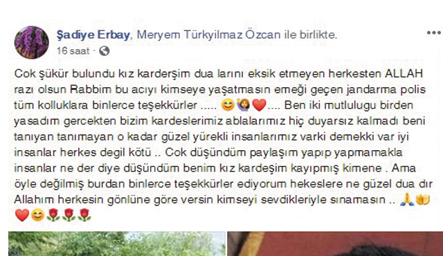 Türkyılmaz'ın yakınları sosyal medya üzerinden yaptığı paylaşımda, destek olan herkese teşekkür ederek, "Başta Jandarma ve polis ekiplerine, bizi seven tüm insanlara desteklerinden dolayı çok teşekkür ediyoruz. Kızımız evine döndü. Allah herkesten Razı Olsun", dedi..