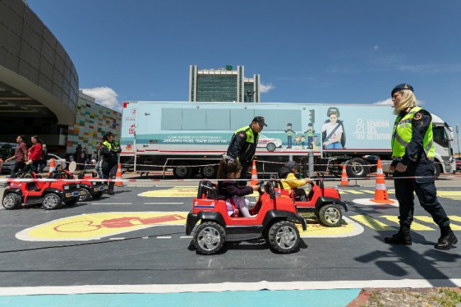 Alanda bulunan "Mobil Trafik Eğitim Tırı'"nda 4 – 10 yaş grubundaki çocuklara trafik güvenliği ve küçük yaşlardan itibaren trafik kurallarının anlatılması gerektiği vurgulanırken, yaya önceliği ile ilgili de önemli bilgiler paylaşıldı.