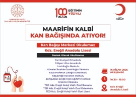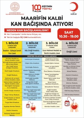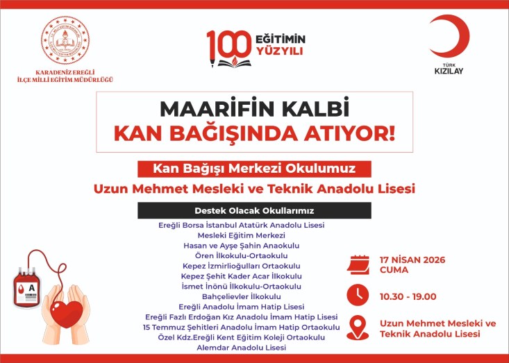 Karadeniz Ereğli İlçe Milli Eğitim Müdürlüğü ve Türk Kızılay iş birliğiyle düzenlenen “Maarifin Kalbi Kan Bağışında Atıyor” kan bağışı kampanyası, 15-18 Nisan 2026 tarihleri arasında dört ayrı bölgede gerçekleştirilecek.