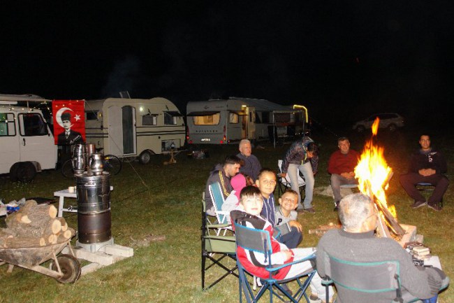 Kınık köyüne karavanlarıyla birlikte Bilecik, Bozüyük, Muğla, Aydın, Bursa, Eskişehir, İstanbul ve İzmir'de gelen karavan sevdalıları Köyde Kınıkspor futbol sahasında yaktıkları kamp ateşi başında hep birlikte şarkılar söyledi.
