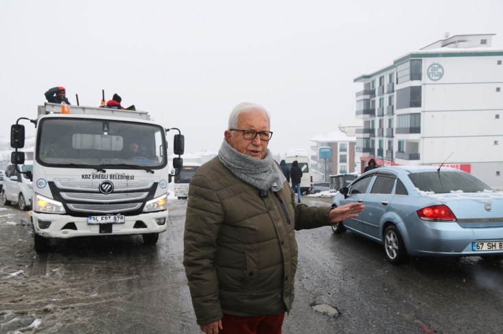 Hastane kavşağındayız şuanda. En önemli merkezlerimizden biri. Belediye olarak çok büyük ağırlık veriyoruz buraya. 24 saat burada hem iş makinemiz var hem tuzlama araçlarımız var. Sağlık bakımından hastalarını getirecek olanlar bir sıkıntıya girmesin diye 24 saat vardiya yapıyoruz. Bu bölgenin kapalı kalmaması için her türlü gayreti gösteriyoruz. Kar yağışı daha çok Ereğli’nin tepe noktalarında yoğunlaşmaya başladı. Sarıkokmaztepesindeyiz. Bütün ekiplerimiz çalışıyor, hem greyderlerimiz hem tuzlama ekibimiz çalışıyor. Tıkalı bir yolumuz yok.”