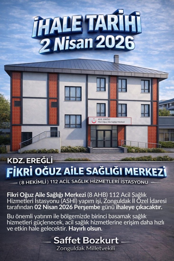 Kdz. Ereğli Fikri Oğuz Aile Sağlığı Merkezi (8 AHB) 112 Acil Sağlık Hizmetleri İstasyonu (ASHİ) yapım işi, Zonguldak İl Özel İdaresi tarafından 02 Nisan 2026 Perşembe günü ihaleye çıkacaktır.